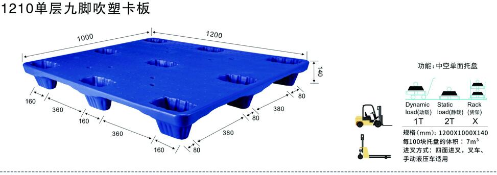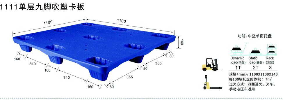 ● 吹塑托盤承載能力:靜載荷:6~7T;動載荷:1~2T;架空載荷:1~1.5T。